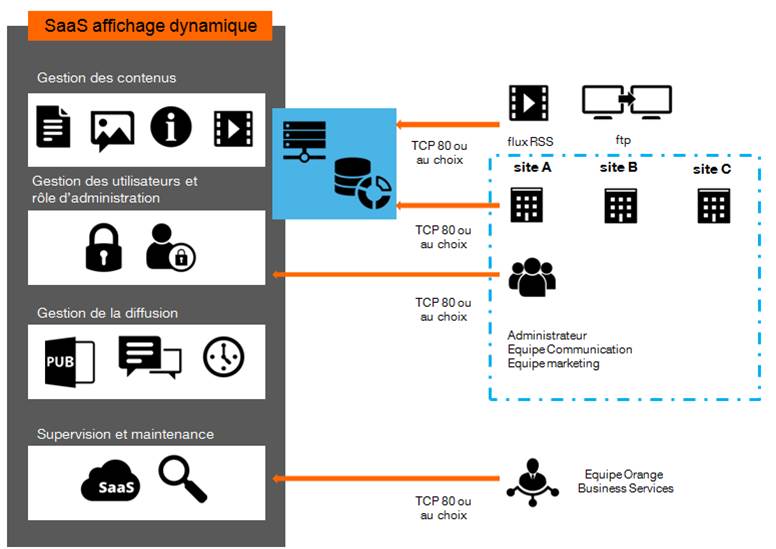 - Hébergement des serveurs de supervision et gestion des contenus en mode hébergé/cloud ou en mode intégré sur site,