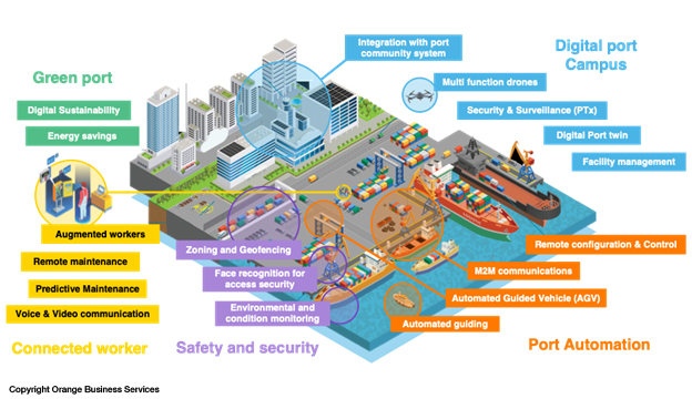 At Antwerp, Orange has worked with the port to deliver a 5G standalone campus network. 5G’s faster speeds and lower latency have enabled new use cases like connected tugboats, computer vision and AI to help detect faults in high-voltage cables around the port. Software-defined networking (SDN) and network slicing mean tenant companies have their own bandwidth and latency tailored to their requirements. In Le Havre, 5G means tenant companies can benefit from real-time data transmission that enables connected robotics, AR maintenance solutions and autonomous vehicles. In both cases, the availability of 5G to enhance operations and reduce costs makes the port more attractive to potential new tenants.