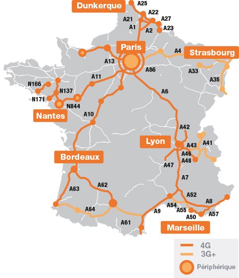- 34 autoroutes couvertes dont 24 en 4G (hors tunnels)La 4G également tout le long du périphérique parisien.
