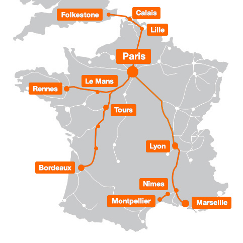- 6 lignes TGV : Paris-Lyon, Lyon-Marseille, Paris-Tours-Bordeaux, Paris-Le Mans-Rennes, Paris-Lille-Calais, Nîmes-Montpellier (en continu, hors tunnels).